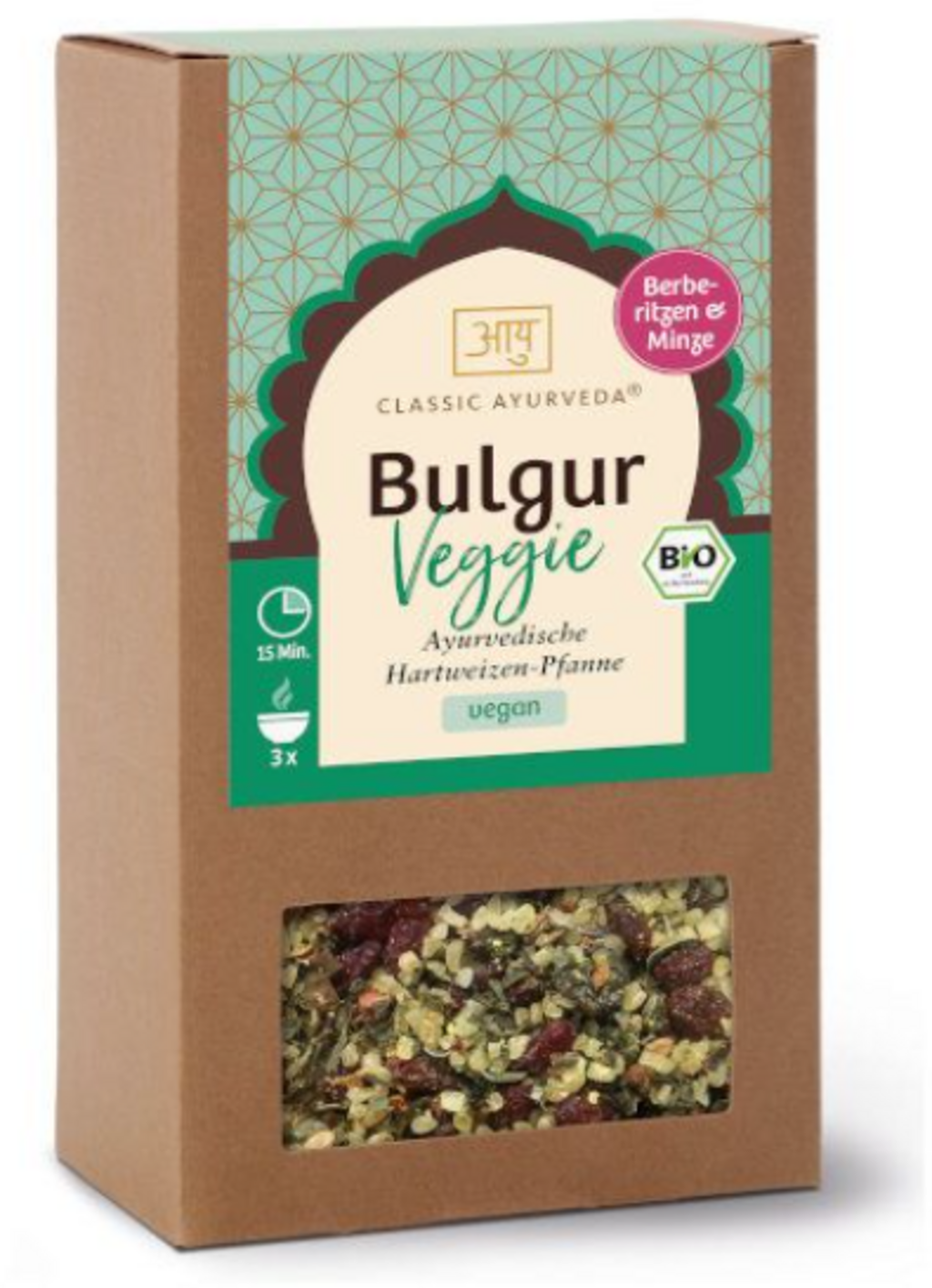 Il Bulgur Veggie offre una base per la preparazione rapida di un pasto completo. La miscela è composta da grano duro bio delicatamente cotto al vapore, arricchito con crespino, datteri e uvetta sultanina. Menta piperita, scaglie di cocco e una selezione di spezie come cumino, curcuma e pippali conferiscono al piatto una nota orientale. Il prodotto è indicato come contorno per piatti di verdure, come ingrediente per insalate o come ripieno per preparazioni in padella e polpette vegetali.