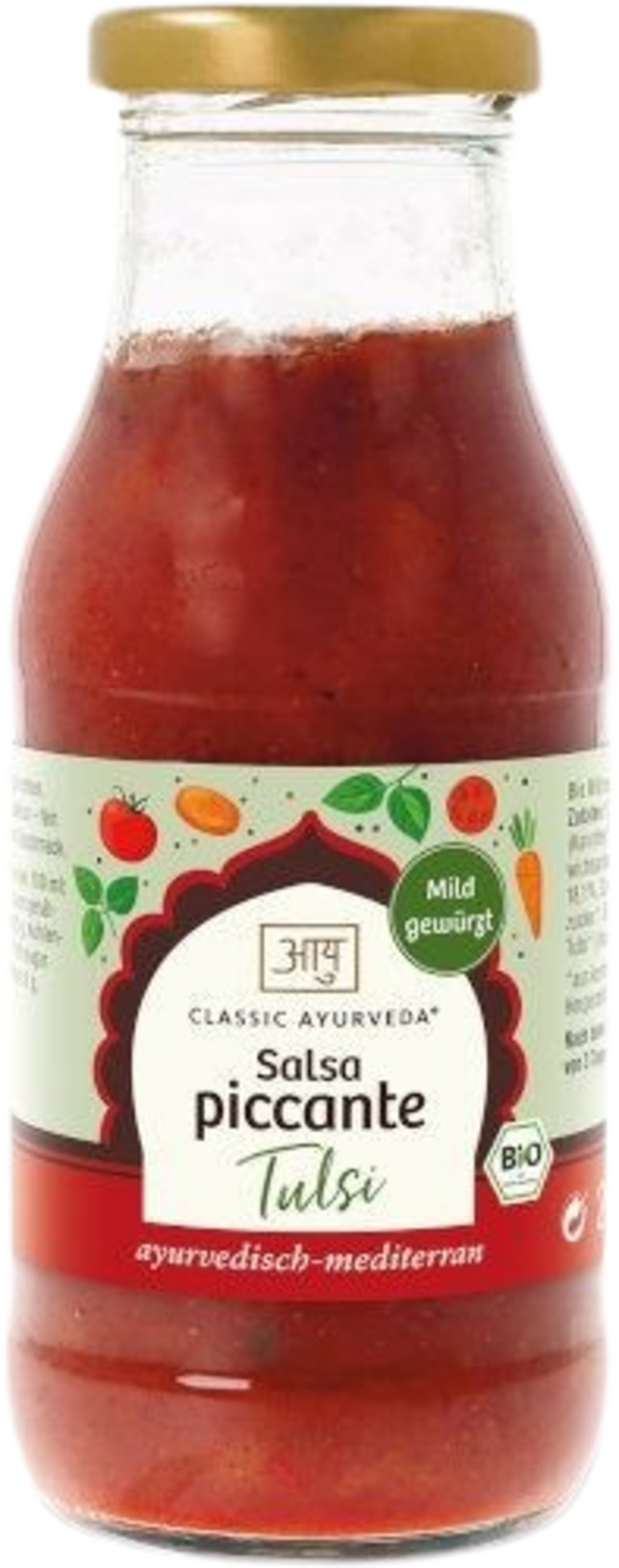 Una salsa speziata di ispirazione ayurvedica di Classic Ayurveda che combina pomodori maturati al sole, sotto forma di passata e concentrato, con una delicata miscela di verdure a base di carote, porro e sedano. La ricetta è arricchita da Tulsi, noto come basilico sacro indiano, e da note riscaldanti di cumino, pepe nero, alloro e asafoetida. L'aggiunta di aceto balsamico bianco, zucchero di canna e sale di roccia crea un profilo equilibrato di sapori dolci, acidi e speziati. Tutti gli ingredienti provengono da agricoltura biologica controllata e rendono la salsa ideale come base per curry, piatti di verdure o pasta.
