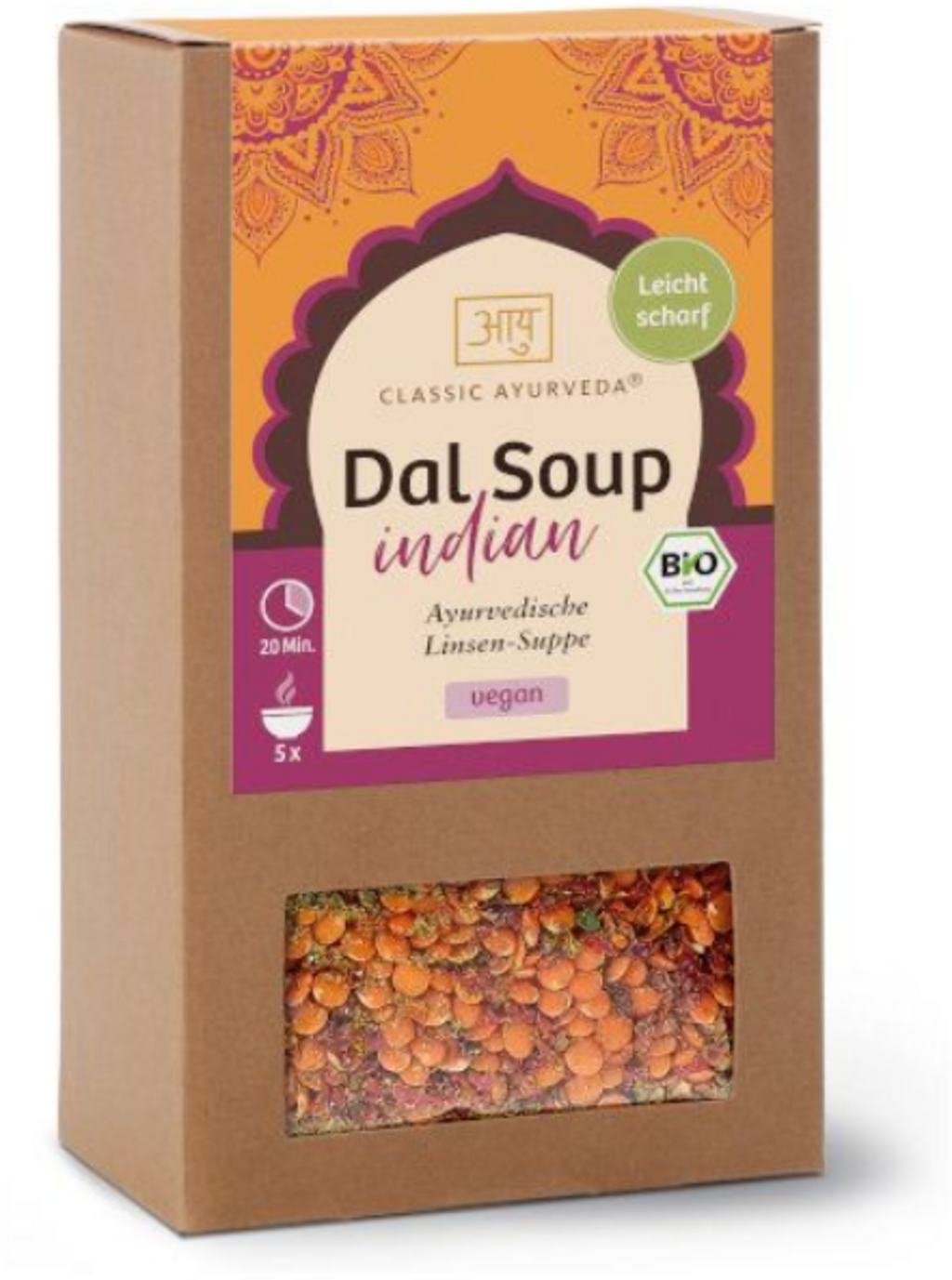 Il Dal è una zuppa indiana di lenticchie che in questa variante combina lenticchie rosse con verdure bio finemente selezionate come carote, paprika e pomodori. La ricetta è completata da una selezione di spezie ayurvediche come cumino, curcuma, zenzero e foglie di coriandolo, che donano una nota leggermente piccante. La miscela è composta al 100 % da ingredienti naturali e non contiene zuccheri aggiunti né additivi artificiali. Ideale come pasto leggero per la sera o all'interno di un'alimentazione consapevole.