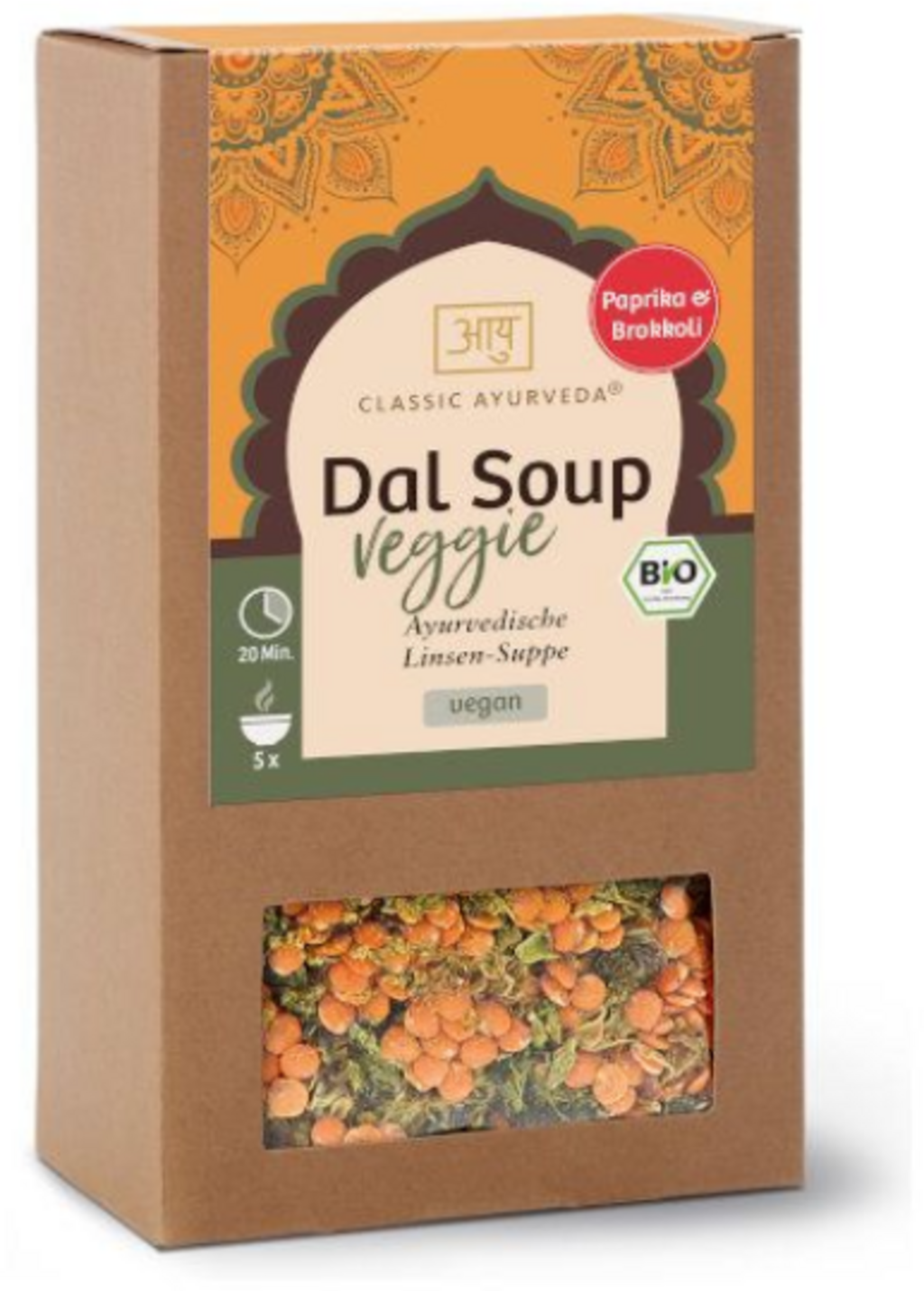 Il Dal è una zuppa di lenticchie che, in questa variante dal gusto delicato, combina lenticchie rosse con verdure bio selezionate come broccoli, paprika e pomodori. Scaglie di cocco, datteri e uvetta sultanina conferiscono alla ricetta una nota morbida e armoniosa, mentre spezie tradizionali come cumino, curcuma e zenzero completano la composizione. La miscela è priva di aromi artificiali e conservanti e offre una base completa per un'alimentazione vegetale. Particolarmente adatta come pasto leggero serale o come componente durante il digiuno intermittente ayurvedico.