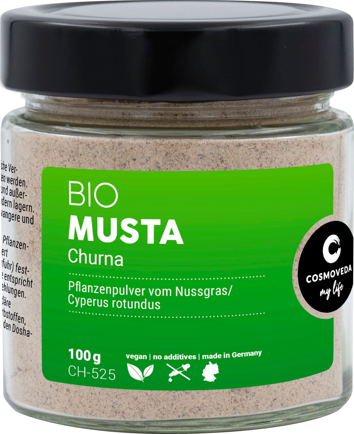 Musta - Cyperus Rotundus - è una pianta perenne che cresce fino a 30-40 cm di altezza nella palude. Vengono utilizzate sia le foglie che le sue radici. Le radici vengono delicatamente lavorate a basse temperature (inferiori a 40 °C) e ridotte in polvere. Le piante provengono dallo Sri Lanka e dall'India da progetti bio fairtrade.