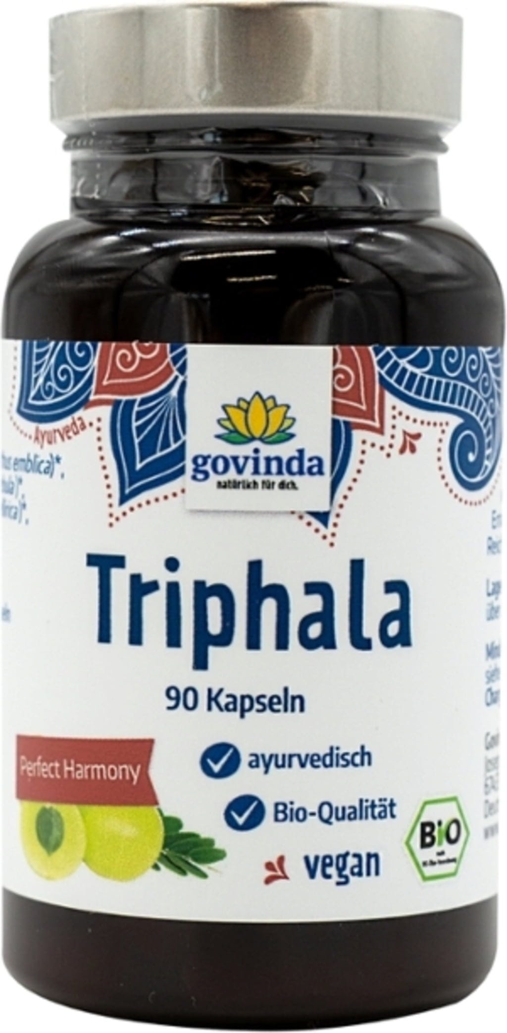 Le capsule biologiche Triphala di Govinda contengono i frutti Amla, Bibhitaki e Haritaki in polvere e possono essere assunte come integratore Tridosha. Poiché il rivestimento della capsula è vegetale, questo integratore è adatto anche per diete vegetariane e vegane.