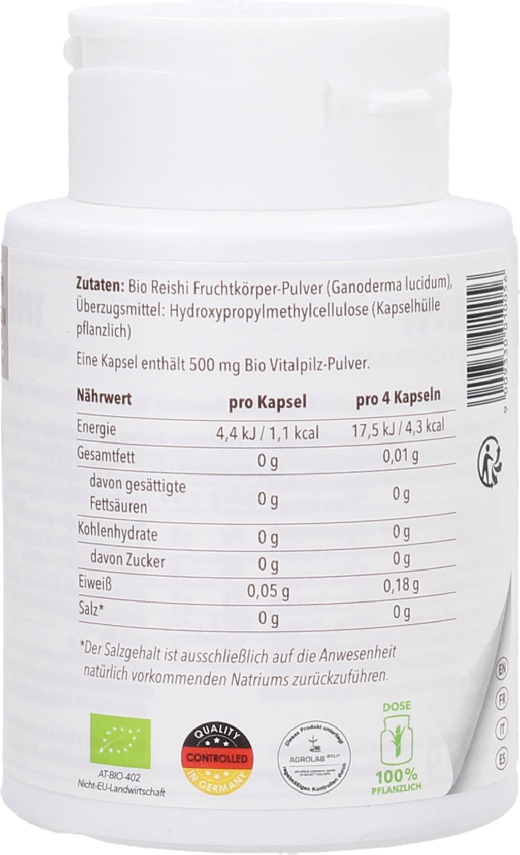Queste capsule sono realizzate con reishi bio in polvere. Il fungo matura naturalmente e viene delicatamente essiccato prima di essere macinato finemente. Il reishi (Ganoderma lucidum) contiene molte vitamine, minerali e oligoelementi.