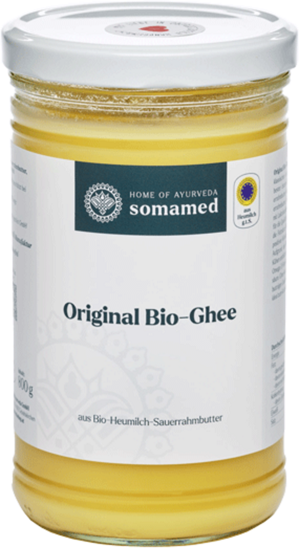 Il Ghee Ayurvedico Originale Bio è un prodotto artigianale originario dell'Alta Austria e a base di panna acida da latte fieno. L'altissima qualità del prodotto è data dalla produzione lunga e complessa, e si evince anche dal colore giallo oro. Il ghee ha una tradizione particolarmente lunga nell'Ayurveda, e si presta ad essere utilizzato per scopi curativi nelle cure Rayasana e non solo. È particolarmente amato anche in cucina, in quanto il suo punto di infiammabilità è elevato e non si ossida quando riscaldato.