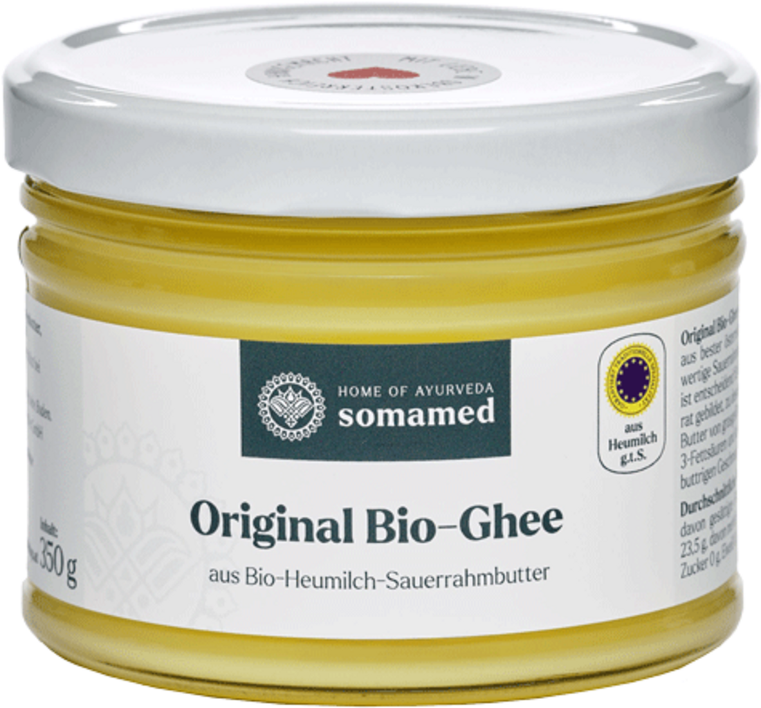Il Ghee Originale Bio è un prodotto artigianale originario dell'Alta Austria e a base di panna acida da latte fieno. L'altissima qualità del prodotto è data dalla produzione lunga e complessa, e si evince anche dal colore giallo oro. Il ghee ha una tradizione particolarmente lunga nell'Ayurveda, e si presta ad essere utilizzato per scopi curativi nelle cure Rayasana e non solo. È particolarmente amato anche in cucina, in quanto il suo punto di infiammabilità è elevato e non si ossida quando riscaldato.