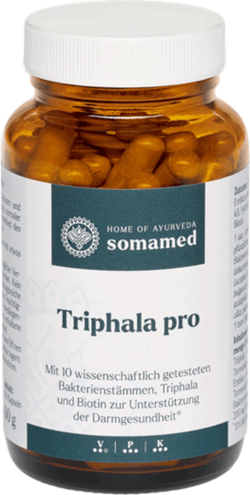 Triphala Pro, sviluppato dal dottor Wolfgang Schachinger, combina la tradizionale ricetta Triphala con una miscela accuratamente bilanciata di 10 ceppi batterici selezionati e biotina. La combinazione unica di ingredienti vegetali e scienza moderna rende Triphala Pro un compagno versatile per un'alimentazione consapevole. La miscela di Haritaki, Amalaki e Bibhitaki (Triphala) è completata da microrganismi di alta qualità e biotina, che sono armoniosamente coordinati tra loro. Ideale da utilizzare nell'ambito di una dieta equilibrata.
