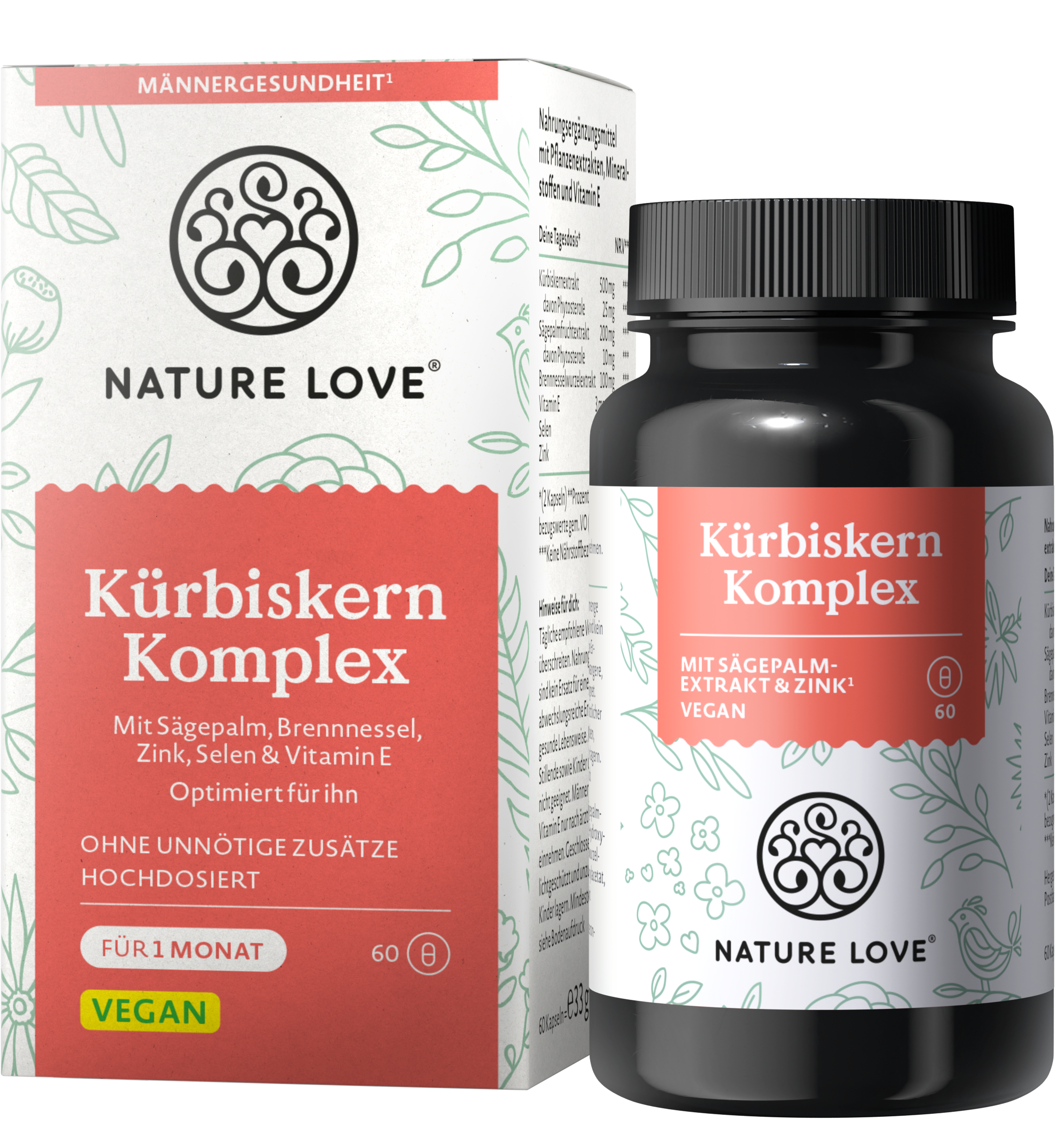 Le capsule vegane al complesso di semi di zucca di Nature Love sono state sviluppate appositamente per gli uomini. Contengono preziosi fitosteroli estratti dai semi di zucca e dal frutto di saw palmetto. Lo zinco, la vitamina E e il selenio forniscono un ulteriore supporto agli uomini.