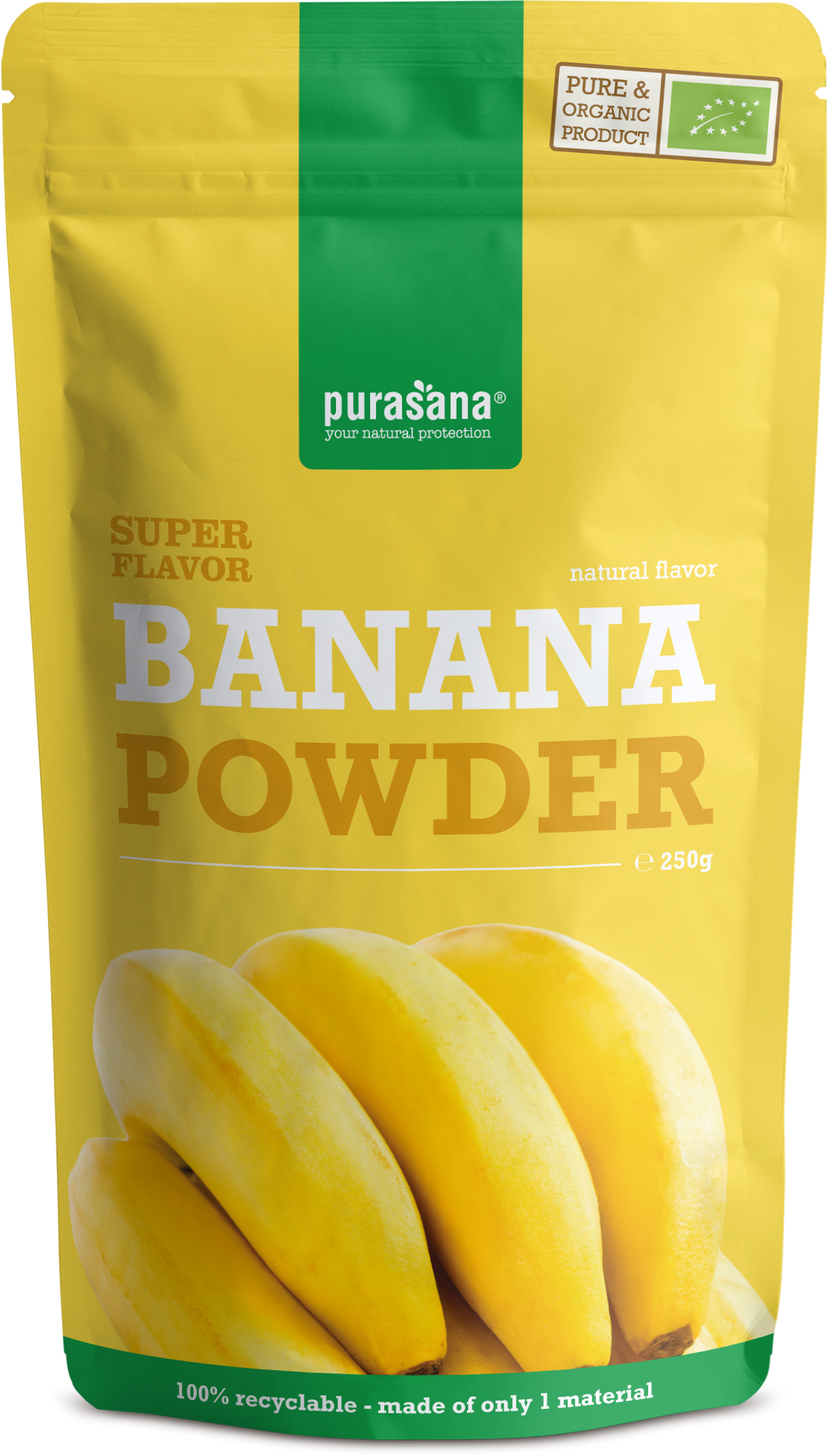 La polvere di banane bio di Purasana offre il 100% di pura polpa di frutta polverizzata. I frutti vengono lasciati maturati al sole in modo naturale e colti nel momento della massima maturazione.