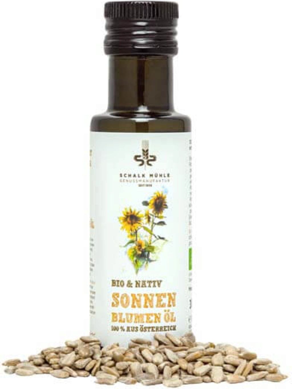 Questo olio è costituito da semi di girasole austriaco, non torrefatti al 100% ed è prodotto con un processo particolarmente delicato nel mulino di Schalk. È delizioso e possiede massima qualità e gusto puro. Può essere utilizzato in molti modi in cucina e ha un alto contenuto di vitamina E e acidi grassi insaturi.
