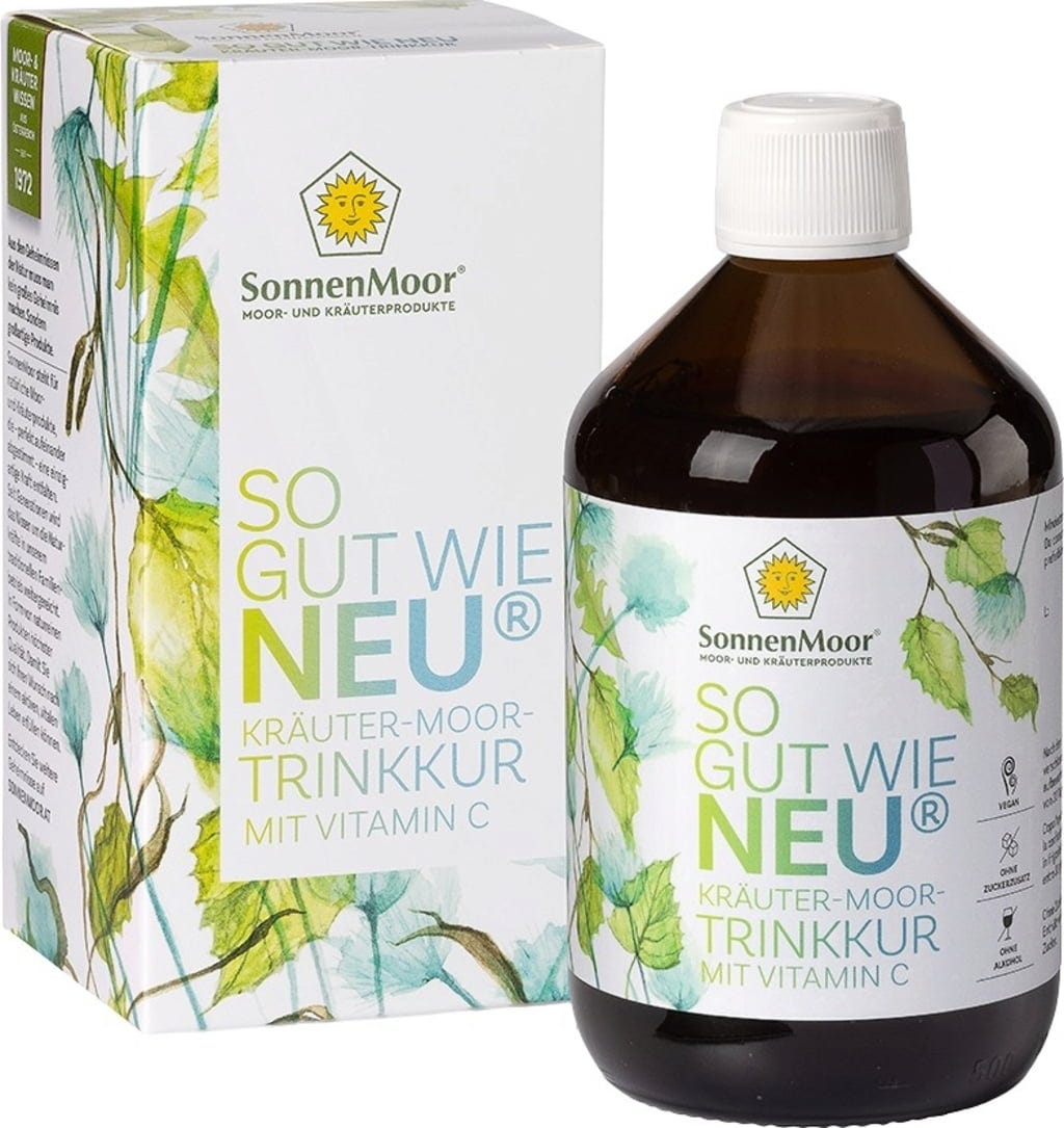 Il prodotto 'Come nuovo' è un estratto concentrato di erbe dell'azienda familiare austriaca SonnenMoor. La formula unisce le caratteristiche di 15 diverse piante, tra cui radice di tarassaco, foglie di betulla, ortica e aglio orsino, con i componenti naturali della torba da bere. Questa miscela liquida è completata da polvere di acerola, che funge da fonte naturale di vitamina C. La vitamina C contribuisce a proteggere le cellule dallo stress ossidativo e supporta il normale metabolismo energetico.