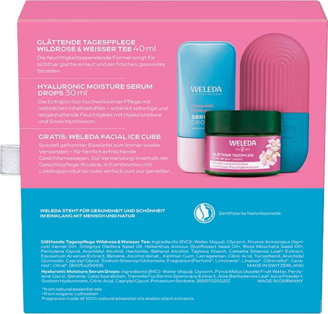 Il Set Regalo YOUR BEAUTY ID contiene una dose extra di trattamento efficace con ingredienti naturali. È composto da Hyaluronic Moisture Serum Drops come booster di idratazione e da Rosa Mosqueta e Tè Bianco - Trattamento Giorno Levigante. Il set è completato dal Facial Ice Cube riutilizzabile per il viso.