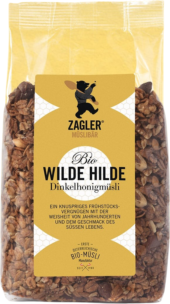 Da ZAGLER MÜSLIBÄR hanno deciso di chiamare questo muesli "Hilde-Dinkel" per sottolineare il fatto che anche Hildegard von Bingen, la famosa santa tedesca che visse in epoca medioevale, era una grande sostenitrice del farro. Ildegarda era una monaca e una guaritrice, la cui medicina attingeva al mondo vegetale e che scoprì il legame tra la salute dell'intestino e i nostri stati d'animo. Ecco perché il farro è l'ingrediente principale in questo mix croccante a cui sono stati aggiunti semi di girasole, mandorle e noci per un gusto semplicemente perfetto. Per una colazione buona e salutare.